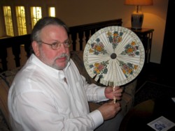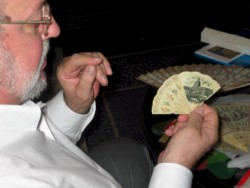 When Thomas told me that he is coming to Germany, I promised to him (and myself) not to miss this opportunity for a personal meeting. After regular and interesting e-mail correspondence, I was curious to see Thomas in person. For those (presumably few) who do not know Thomas, here a short description: "You must have a wide angle imagination as I am a very big guy! (6' 2" and over 300 pounds!)" - these are his own words that display a characteristic feature: his humour. Apart from the physical appearance, his knowledge on fans (and in particular Chinese fans, both national and for export) is even more impressive. And his taste for good food and good wine! Before entering into the core subject (fans, as you may have guessed), he treated me to an exceptional lunch at one of Germany's "maître d' " restaurants. To describe it in fan terminology: The aperitif was as sparkling as a Duvelleroy paillette fan; the "amuse-bouche" menu showed the broad panoply of ingredients, prepared with the novelty spirit and imagination that equal those of novelty fan inventors (just some examples of this culinary delight: the tiny deep fried spring onions were arranged like a coral next to a Coquille St. Jacques; the "capuccino" turned out to be a curry-lemon grass velouté; and the "Crème Brûlé" was indeed a crème brûlé, but of Foie Gras!). All accompanied by a Chardonnay 1988(!) that can only be compared to the most exquisite of early Chinese export fans, the brilliance of the gold preserved - in this particular case, liquid gold! Apart from