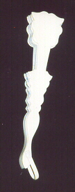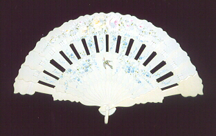 Elfenbeinfarbener Zelluloid-Fächer "Cabriolet". Die Stäbe sind mit Büten und Blumengirlanden bemalt. Dieser Fächer hat eine interessante Form, wenn er geschlossen ist (siehe unten). Ein ähnlicher Fächer ist auf der Titelseite von C. Fendels Buch "Celluloid fans". Ivory-coloured celluloid-fan "cabriolet". Sticks are painted with flowers and flower garlands. It has an interesting form when closed (see below). A similar fan is shown on the cover of C. Fendel's booklet "Celluloid fans".