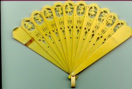 Sehr kleiner Zelluloid-Fächer, dessen Charme in der gestanzten Reihe einer tanzenden Kolumbine (?) und eines flötenspielenden Pierrots (?) liegt. Das Seidenband fehlt. Österreich? 1910? Tiny celluloid fan whose charme rests in the punched upper ends displaying a dancing Colombine (?) and a flute-playing Pierrot (?). The ribbon is missing. Austria? 1910? |
