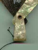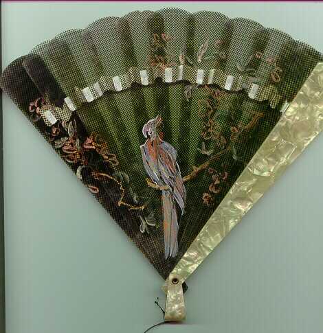 Relativ grosser (ca. 19cm Stablänge) Zelluloidfächer. Die beiden Deckstäbe und die Schlaufe sind aus olivgrünem Perlmutt-Imitat. Die restlichen Stäbe sind dunkel-transparent mit einem leichten Gitteraufdruck. Der Papagei und ein paar Zweige sind mit Metallfarben per Hand aufgemalt. C. Fendel hat einen Fächer ähnlichen Typus auf S. 20 (#22) abgebildet. Aufgrund der Machart (Öse statt Dorn, kleine breite Schlaufe, Grösse im allgemeinen) dürfte es sich um einen italienischen Zelluloid-Fächer handeln. Relatively big celluloid fan (approx. 19 cm length of the sticks). Both guard sticks and the loop are made of celluloid imitating olive mother-of-pearl. The sticks are dark-transparent with a faint grid printed on them. The parrot and some branches are hand-painted with metal colours. C. Fendel shows a similar type fan on p. 20 (#22). This type of celluloid fan appears to be Italian: pressed-in eye instead of a pivot, broad short loop, the size in general. |