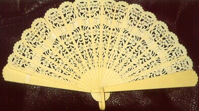 Durchbrochener Zelluloid-Fächer, elfenbeinfarben, 16 Stäbe, 2 Deckstäbe voll; Öse und Dorn-Kappen original und vorhanden; Seidenband original in der Fächerfarbe. Höchstwahrscheinlich Österreich, 1910 Pierced celluloid-fan, "ivorine", 16 sticks + 2 panaches (full celluloid); loop and pivot cover original celluloid, silk ribbon original. Approx. Austria 1910. |
