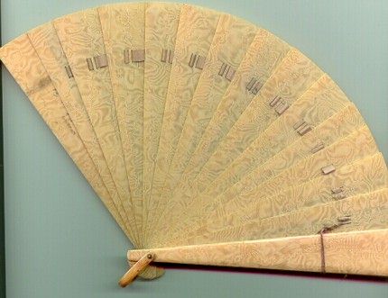 Rosé-farbener Zelluloid-Fächer mit Moiré-Musterung. Das original Seidenband ist an einer Seite unfachmännisch am Deckstab angebunden worden. Ein ähnlicher Fächer befindet sich im Krakauer Nationalmuseum, allerdings mit teilweise gestanzten Stäben (Nr. 109 des Katalogs, siehe Biblio Nr. 70). Dort wird er mit "Wien (?), Anfang des 20. Jhdt.s" bezeichnet. Rose-coloured cellulloid fan with Moiré pattern. The original silk ribbon is unprofessionally fixed at one guard stick. A similar fan (with partly punched sticks) can be found in the National Gallery of Cracow (No. 109 of the catalogue, see Library No.70). There it is described as "Vienna (?), beginning of the 20th century". |