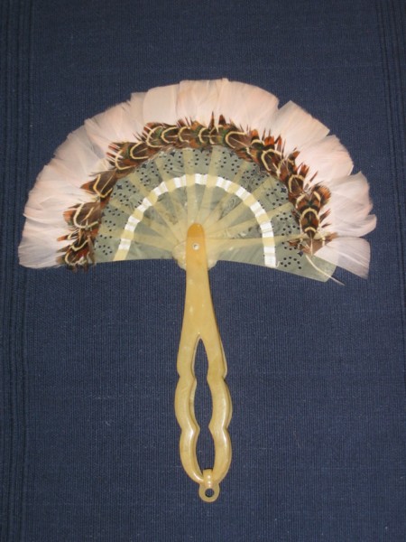 In C. Fendel's Buch (#67, S. 41, Biblio No.47) sind diese Art Fächer beschrieben als "éventail de poche" (= Taschenfächer), eine französische Erfindung um die Jahrhundertwende von 1900. Sie wurden mit eingefärbten Hühnerfedern verziert. Das Zelluloid-Gestell war oft auch Schildpatt-Imitat, Elfenbeinimitate waren auch manchmal bemalt. Der hier gezeigte hat ein kleines gestanztes Muster auf den Fächerstäben. Die beiden Griffe werden durch einen kleinen Haken zusammengehalten. This kind of fan is described as "éventail de poche" (=pocket fan), a French invention around 1900, by C. Fendel (#67, p. 41, Library No.47). Dyed fowl's feathers were used for the decoration. The sticks were often made of fake tortoiseshell or ivory, the latter sometimes painted with floral motives. The fan shown here shows a small punched design on the sticks. The handles are held together with a small hook. |