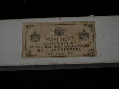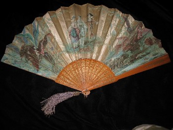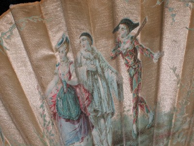 This silk satin fan was presumably manufactured by Alexandre, Saint Petersburg, as the label on the corresponding box tells us in cyrillic. It is a chromolithography, depicting Colombina, followed by Pierrot and harlequin. The turquoise/lilac colour scheme is enhanced by the original lilac tassel. Wooden sticks, with gold embossed ornaments. |