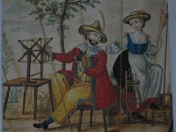 This "Hanswurst" fan, approx. 1720, was probably produced in Vienna and shows the famous popular comedian character "Hanswurst" at a rather rare household chore. This fan, together with a similar one are in the collection of the Carolino Augusteum museum in Salzburg, Austria. The costume of Hanswurst corresponds more to provincial garments than theatrical ones. His black half mask that covers the lower part of the face is typical and must not be confused with a beard. |