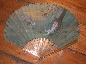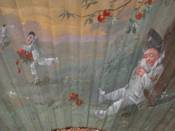 This balloon silk fan is painted with gouache colours and shows a sleeping Napoleon-Pierrot, while other pierrots that obviously stole apples from the tree, retreat, running. No signature. The backside is also made of silk, but without painting. The sticks are made of horn, with gold embossed ornaments. Ca. 1900, France?