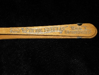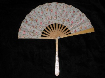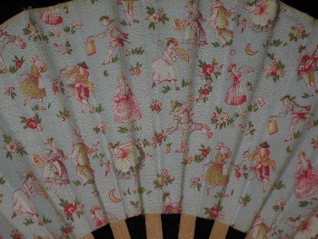 This Viennese patent fan displays additional handle sticks. The sticks are made of plain wood, the handle has an inscription that gives the origin of the fan (either producer or shop) "Fin de Siècle", located in "Kärntnerstrasse" in Vienna, a noble address. The fan leaf is made of cotton and printed with moving figures, amongst them harlequin and ladies with fans. End 19th century, Austrian.
