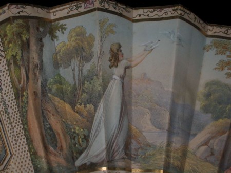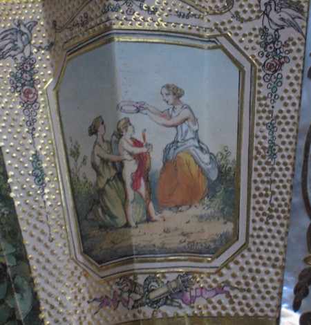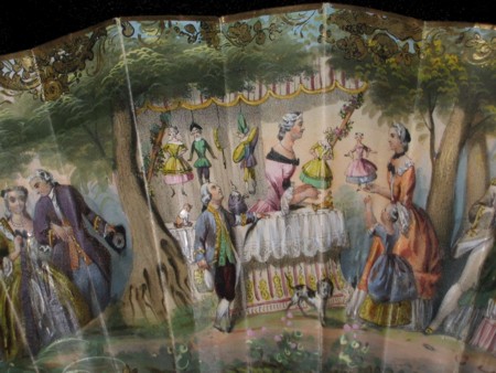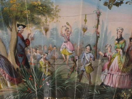 This lithographic fan with hand-colored scenes has a wonderful mother-of-pearl