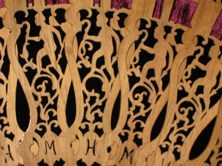 Handgesägter Holzfächer mit Amor, der in einer Hand einen