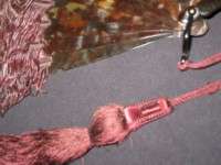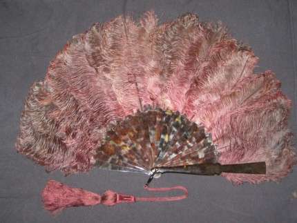 Reddish brown dyed ostrich feather fan with tortoise-shell sticks. THe feathers are curled to enhance their thickness. The sticks are made of dark tortoise-shell, partly mottled. The loop is of the same material. A reddish brown cord with a tassel is fixed to the loop. France (or Belgium), around 1900.