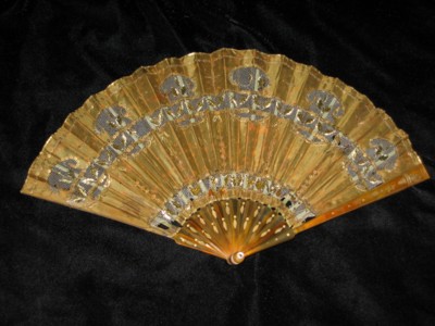 Dieser Fächer ist aus grünlich-goldener Seide mit Gitter-Einsatz und Paillettenstickerei hergestellt. Der untere Blattrand ist beschädigt, da die dort angebrachten Pailletten durch das Falten den Stoff verletzt haben. Die Stäbe sind aus Horn, mit kleinen goldenen Dekorationen. Ca. 1805, wahrscheinlich Frankreich. Die kleine Pappkarton-Schachtel scheint original zu sein, hat aber keine Fabrikationsangaben. This fan is made of greenish-golden silk, with a grid of gaze and embroidered with sequins and spangles. The lower part of the leave is damaged as the spangles hurt the tissue when folded. The sticks are made of horn, with some golden decoration. It comes in its (original?) box, but no fan makers label is attached to it. Approx. 1805.