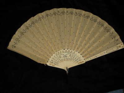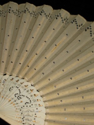 Fächer aus Crêpe de Chine mit Pailletten verziert. Die Beinstäbe sind mit Silber- und Goldornamenten verziert. Der hintere Deckstab fehlt. Frankreich? Um 1900. Fan made of Crêpe de Chine (silk) and sequins and spangles. The sticks are made of bone, decorated with gold and silver ornaments. The left guard stick is missing. France ? approx. 1900 |