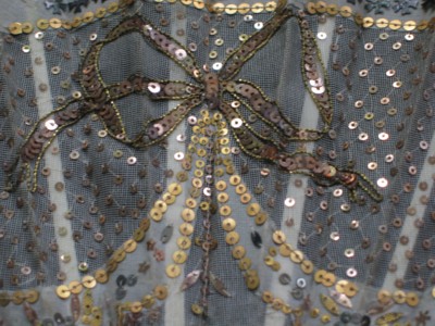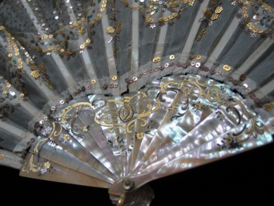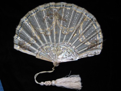 Ball- oder Hoffächer, aus Gaze mit Pailletten bestickt in Form einer Masche. Die Ballonform - die mittleren Stäbe sind höher als die seitlichen - ist typisch für Fächer der vorigen Jahrhundertwende. Die Perlmuttstäbe haben eine "barocke" Form und sind mit Goldornamenten verziert. In der Mitte ist ein kleines Freiherren-Krönchen. Der Fächer stammt aus Adelsbesitz. ca. 1905, Österreich (?) Ball or court fan, made of gauze and embroidered with sequins and spangles that form a bow. The balloon type fan - central sticks are longer than lateral sticks - is typical for the last turn of the century. The sticks are made of mother of pearl, in a "baroque" form, and decorated with gold and silver ornaments. In the centre, a small baron's coronet is carved. The fan was owned by Austrian aristocrats. approx. 1905, Austria (?) |