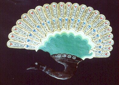 Indonesischer Büffelhaut-Fächer, gestanzt und bemalt in Form eines Pfauenrades; Pfauenkopf und - hals aus Büffelhorn geschnitzt, Ende 20. Jhdt. Ein sehr ähnlicher Fächer, nur in Weiss/Gold gehalten, ist in Payer-Appenzeller's Fächerbuch (Biblio No.4) abgebildet. Indonesian Buffalo skin fan, punched and painted like a spread peacock tail. Peacock head and neck cut in buffalo horn, end 20 c. A very similar fan in white/gold is shown in Payer-Appenzeller's fan book (Library No.4). |