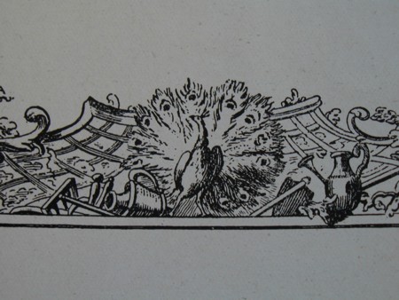 Dieser Pfau ist Teil eines graphischen Rahmens für das Parfum "Prince Matchaballi". Es stammt aus der Zeitschrift "La France Illustrée" aus 1947. This peacock is part of a frame for the perfume "Prince Matchaballi". It appeared in "La France Illustrée" of 1947. |