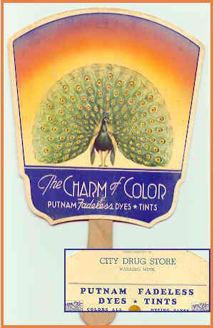 US-Werbefächer für Putnam-Farben, auf der Website www.hand-fan.org 1998 zum Verkauf angeboten. Der Pfau hier als Symbol prächtiger Farben. Wurde ursprünglich mit "Compliments of City Drug Store, Wabasso, Minn." ausgegeben. Amerikanische Werbefächer sind häufig Stiel-Fächer. Sie werden auch heute noch produziert, z.B. für Wahl-Kampagnen oder Baseball-Spiele. US-publicity fan for Putnam dyes, found on the www.hand-fan.org website 1998 where it was on sale. The peacock serves here as a symbol for bright colours. Originally it was given away with "Compliments of City Drug Store, Wabasso, Minn." American publicity fans are often the fixed variety. Similar fans are still produced nowadays, for electorial campaigns and baseball matches.