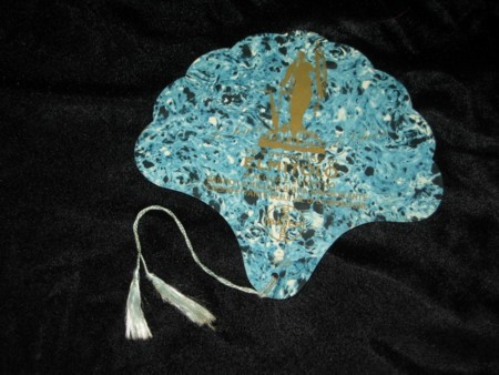 Blau-marmorierter Zelluloid Fächer mit goldener Aufschrift und Figur mit Schal und Schirm für "Elmitolo", sowie dem "Bayer" Logo. Elmitolo war eine Brausetablette zur Desinfektion bei Erkältungen. Abgebildet in Gobbi Sica's "Il ventaglio pubblicitario", sie datiert in mit "1930ger Jahre", Italien. Blue marmorised celluloid card-fan with golden inscription and print of a female figure with a shawl and umbrella for "Elmitolo", and the "Bayer" trademark logo. Elmitolo was a efervescent tablet for desinfection when catching a cold. It is shown in Gobbi Sica's book "Il ventaglio pubblicitario". She dates it with "1930ies", Italy.