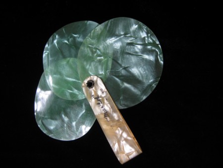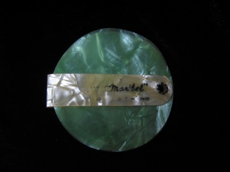 Sehr kleiner, zusammenschiebbarer Zelluloid-Fächer, Perlmutt imitierend. Im geschlossenen Zustand (siehe unten) ist der Durchmesser nicht mehr als 5.5 cm. Trotzdem ist er, was das Fächeln betrifft, recht effizient. Vermutliche Herkunft ist Argentinien. Am Griff ist "Maribel" lesbar, ein Geschäft oder Produkt, für das der Fächer warb. Tiny, collapsible celluloid fan, imitating mother-of-pearl. When closed (see below), the diameter does not exceed 5.5 cm. However, for fanning it is surprisingly efficient. Probable provenience is Argentina. The handle has an inscription that reads "Maribel", a shop or product for which the fan advertised.