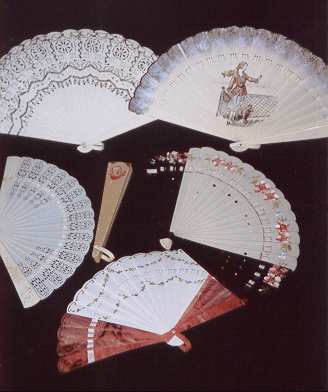 Von links oben im Uhrzeigersinn: Elfenbeinfarbiger, durchbrochener Zelluloidfächer. Das Muster ist mit Flitter aufgetragen; Elfenbeinfarbiger Zelluloidfächer, handbemalt mit einer Tennis-Szene mit Hund, der Rand ist laviert; Zelluloidfächer mit je 4 Stäben aus Schildpatt-Imitat links und rechts, bemalt mir rosa und weissen Blüten; Zelluloidfächer mit je 4 Stäben aus rosa Perlmutt-Imitat links und rechts, die elfenbeinfarbenen Innenstäbe mit Blumengirlanden bemalt; Einfacher durchbrochener elfenbeinfarbiger Fächer; geschlossener elfenbeinfarbiger Fächer mit applizierten Frauenprotraits. From left above clockwise: Ivory-cloloured pierced celluloid fan, the design made of applied tinsels; ivory-coloured celluloid fan painted with a tennis scene with dog. The border is coloured in grey-blue; celluloid-fan with 4 sticks of tortoise-shell imitation left and right, painted with pink/white blossoms; celluloid-fan with 4 sticks of pink mother-of-pearl imitation left and right, the ivory-coloured sticks painted with garlands of flowers; ivory-coloured, pierced fan; closed fan with applied women's portraits. |