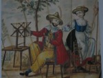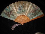 her mask and fanned herself with it. The fan was born! The most famous mask fan is the early 18the century fan quoted and depicted so often in literature, in printed and painted versions. But the fan leaves of the mid-18th century also show court balls in masks, with persons disguised as characters of the Commedia dell'Arte. One example is the detail of such a fan, fig. 6. It is shown in Avril Hart and Emma Taylors book on fans (Biblio No. 2). These fans are nowadays rare, in 2000 a similar fan was sold at Christies for more than 16000 EURO! The topic of the Commedia dell'Arte re-emerges again in the mid-19th century with its love for 18th century topics. Although some commedia costumes date from the beginning of the 19th century, the performances were declining. It must be noted, however, that its influence on German and Austrian popular scene plays and characters of the 19th century was considerable. The well-known "Hanswurst" features similar dresses as well as the slapstick ("Holzpritsche" in old fashioned German). Two rare fans of this topic are in the collection of the Carolino Augusteum Museum in Salzburg (see fig. 7, with Hanswurst performing an atypical household chore). It is interesting to note that Hanswurst also wears a half-mask, but on the LOWER part of his face! (It is not a beard as one might think!). Masked balls during carnival time (in Vienna called "Redouten" from the Italian "ridotto") were customary in Austria, but also in France during the 19th century. The more exquisite fans produced for this occasion were re-makes of 18th century fans. The simpler versions printed them on silk (fig. 8). During the Belle Epoque and the beginning of the 20th century, Commedia dell'Arte characters are transformed into small Pierrots that look more like naughty Putti (fig. 9). The topics of apple-stealing pierrots appear also in fan literature such as S. Mayor (Biblio No. 25). |
