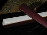 Dieser Fächer ist aus grünlich-goldener Seide mit Gitter-Einsatz und Paillettenstickerei hergestellt. Der untere Blattrand ist beschädigt, da die dort angebrachten Pailletten durch das Falten den Stoff verletzt haben. Die Stäbe sind aus Horn, mit kleinen goldenen Dekorationen. Ca. 1805, wahrscheinlich Frankreich. Die kleine Pappkarton-Schachtel scheint original zu sein, hat aber keine Fabrikationsangaben.