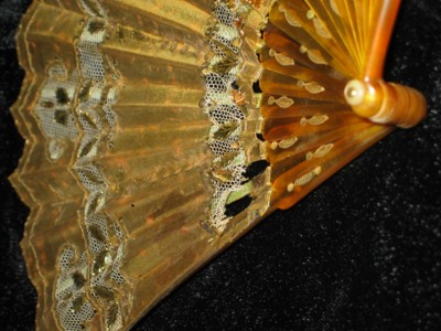 This fan is made of greenish-golden silk, with a grid of gaze and embroidered with sequins and spangles. The lower part of the leave is damaged as the spangles hurt the tissue when folded. The sticks are made of horn, with some golden decoration. It comes in its (original?) box, but no fan makers label is attached to it. Approx. 1805.