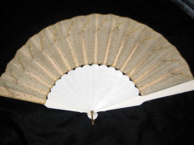 Fächer um 1880, aus Crêpes de Chine, am oberen Ende bestickt mit Pailletten in Form von Lorbeerzweigen, den Empire-Stil nachahmend. Die vollen Elfenbeinstäbe sind ohne Verzierung. Österreich ? Pastiche Empire fan, around 1880, made of Crêpe de Chine (silk), embroidered with spangles forming laurel leaves at its upper part. The full ivory sticks have no decoration. Austria? |