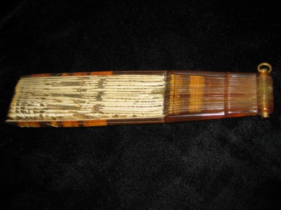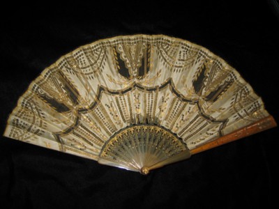 Fächer aus cremefarbiger Seide und Metallnetz, mit applizierten Pailletten in geometrischen Mustern. Durch das Metallnetz ist der Fächer relativ schwer. Dieser Fächer sieht auf den ersten Blick wie ein originaler Empire-Fächer aus. Der "tunnelförmige" Kopf spricht auch dafür, aber das kleine Metallringlein am Dorn ist typisch für Fächer um 1900. Ein Porträt Mme. Duvelleroys, gemalt von Louise Abbéma aus 1905, zeigt sie mit einem ganz ähnlichen Fächer. Es könnte sich daher bei diesem Fächer um eine Reproduktion eines Originals handeln. Frankreich ? Fan made of cream-colored silk and metal mesh, with applied spangles in geometrical decoration. The metal mesh makes the fan relatively heavy. At first glance, this fan can be considered an origianl Empire fan. The tunnel head accounts for it. However, the small metal ring at the rivet is typical for fans around 1900. A portait of Mme. Duvelleroy, painted by Louise Abbéma in 1905, shows her with a similar fan in hand. It is possible that this fan is a reproduction of an original. France ? l