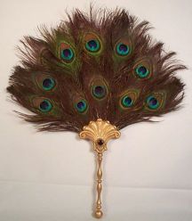In Greece, peacocks were the holy birds of Hera - Juno (goddess of home and marriage). They were shown for the first time at the temples of Hera in Samos. Greek mythology (with some variations) and Ovid's Metamorphoses explain the peacock's "eyes" on his tail feathers as follows: Hera-Juno, jealous of Io who was transformed into a white heifer by Zeus, ordered thousand-eyed Argus to watch over Io. Hermes, sent by Zeus to free Io, decapitates Argus. Juno collects all his eyes and applies them to her beloved birds, the peacocks. Besides the short-handled leaf-fan as shown on Tanagra-figures ("Ripidion", see fig.3) and fire fans ("Ripis"), the Greek used also feather fans made of peacock-feathers. Such feather fans are mentioned in Euripides' "Orestes". Another story tells that young girls unhappily in love dedicated their peacock feather fans to Aphrodite, goddess of love (op.cit. Buss). Peacock feather fans were in fashion around 400 and 300 B.C. Ancient Romans knew long-handled fans, often decorated with peacock feathers as depicted on Apulian vases, and small hand fans, so-called "tabellae". The latter is used in Ovid's third book of love when the lover fans the face of his beloved while she is asleep.