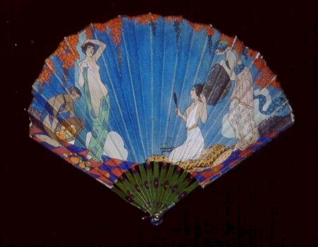 Barbier *1882 in Nantes, + 1932 in Paris A. Flament was right. When typing the name Barbier into the search engines of the Internet, innumerable websites selling Barbier re-prints pop up. The person Barbier, though, remains in the dark. We do not know much about him. Just that he studied at the "Ecole des Beaux Arts" in Paris, together with his famous contemporaries Paul Iribe and Georges Lepape. Erté became one of his best friends. He himself received attention only in 1911, after he exhibited in the gallery Boutet de Monvel. Poiret, famous fashion designer of his time, engaged him (together with Iribe and Lepape) as fashion designers In those times, Paris became "the" fashion centre. Influenced by exotic-oriental tastes following the world exhibitions and performances of Diaghilev's "Ballet Russe" (1909), a style was developed that received later on the name "Art Déco" (decorative art). But Barbier was also inspired by 18th century costumes that displayed a similar lust for entertainment and luxury, albeit in another style. Barbier worked for fashion journals such as "Gazette du Bon Ton", "Journal des Dames et des Modes" ,"Vogue" or "Harpers" and published himself "Falbalas et Fanfreluches" that could be translated as "Ruffles and Frills". Furthermore, he designed theatre costumes, costumes for the "Folies Bergères" and for the film by and with Rudolfo Valentino "Monsieur Beaucaire". Following the "Zeitgeist" he (as well as his other contemporaries) also designed fans that were often printed as publicity fans in thousands of copies. This particular fan is printed on silk, signed and dated "1912". There is a handwritten remark in the right red corner (see below) that says: Lubin. Thus, it can be assumed that this model was made for the perfume producer Lubin. The same fan (albeit with a slightly different pattern on the sticks) is published in several journals and books. It is entitled "publicity fan" (H. Alexander, Fans), "Ladies making their toilet" (article "Fächer, Zepter der Damen", in "Pan" 1985) or described as "exotic fan in the sultana style" (F. Falluel in "L'Estampille" 1985).