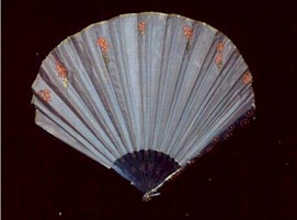 The sticks are made of bone and painted with ornaments that pick up designs of the fan leaf. The revers is made of blueish silk with some cascading floral decoration, reflected on the sticks. The balloon shape shows a scalloped profile when closed (see below).